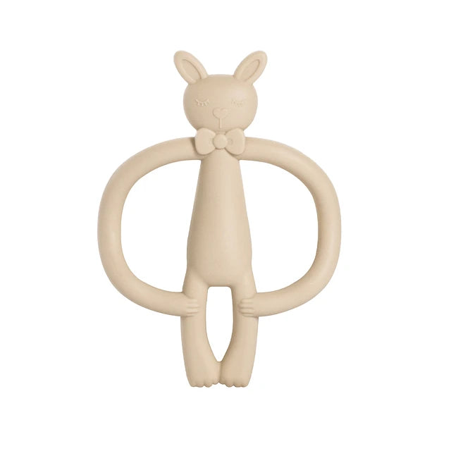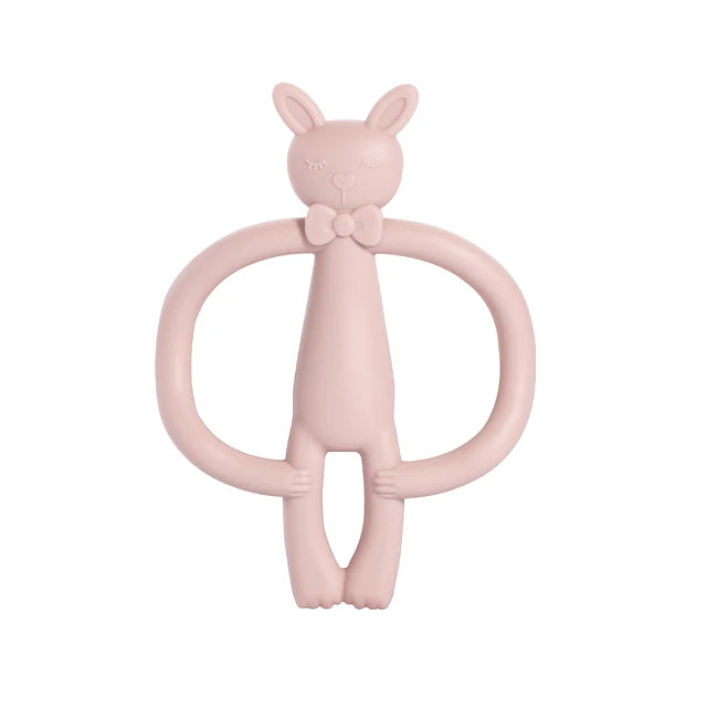 Mordedor conejito de silicona rosa, ideal para aliviar las encías durante la dentición de tu bebé, estimulando sus sentidos con un diseño adorable y seguro.